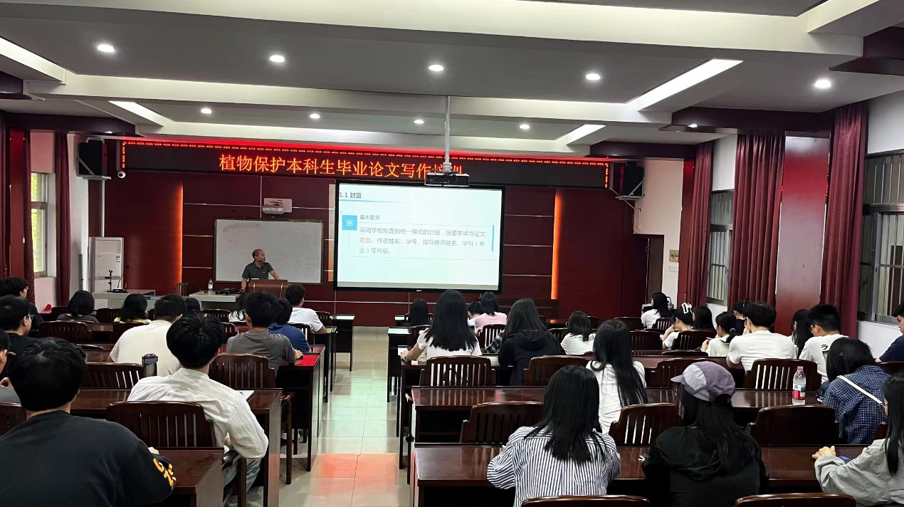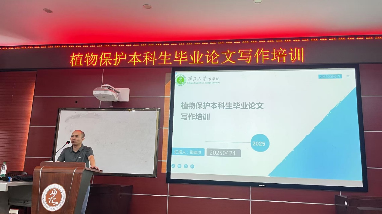 为进一步强化公司本科毕业设计(论文)环节的教学质量,确保2025届本科生能够高质量地完成毕业设计(论文),根据公司、公司工作安排,公司植物保护系于2025年4月24日在公司306多媒体教室开展了“植物保护本科生毕业论文写作培训”。主讲老师郑德洪副教授就本科毕业论文的题目、中英文摘要、前言、材料与方法、结果与分析、讨论与总结等各部分开展了详细的写作指导,并通过实例分析了毕业论文写作的规范和注意事项。最后,郑德洪老师以“数据不说谎、学术即修行、批判中成长”总结了如何写好本科毕业论文,并殷切希望同学们进入冲刺状态,认真打磨好毕业论文。