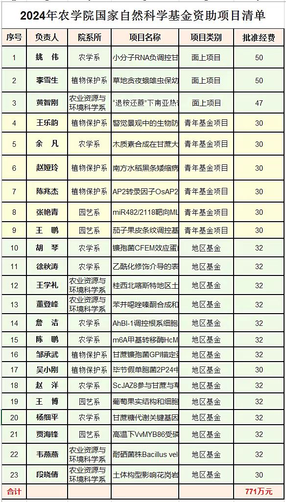2024年,公司共申报105个项目,其中包括优青2项、联合基金2项、面上项目20项、青年基金36项、地区基金45项。最终23个项目获得资助,资助率达到21.9%,显著高于全校近五年的平均资助率。甘蔗相关的获批资助项目8项,其中面上项目2项,青年科学基金项目1页,地区基金项目5项。