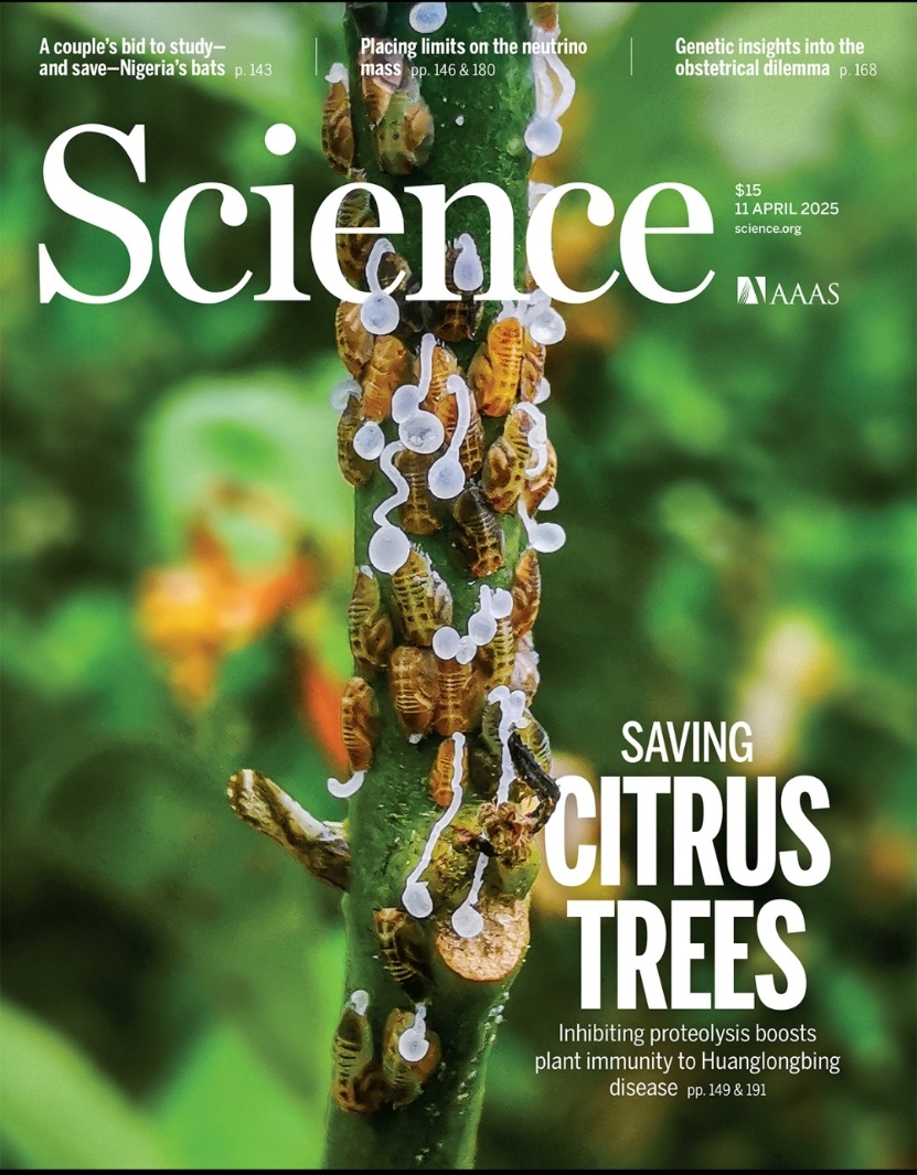 2025年4月11日,中国科公司微生物研究所叶健研究员团队在《Science》杂志以封面文章形式在线发表题为Targeted MYC2 stabilization confers citrus Huanglongbing resistance的研究成果。该研究首次系统性解析了柑橘应对黄龙病(Huanglongbing, HLB)的核心分子机制,揭示了由E3泛素连接酶PUB21与转录因子MYC2构成的抗性遗传调控网络。基于机制解析,该团队通过人工智能辅助筛选技术鉴定出双功能肽APP3-14,该小肽可特异性稳定MYC2蛋白并阻断其泛素化降解。田间验证显示,APP3-14能显著抑制黄龙病病原菌扩散,单季防控效率达80%,且对柑橘植株生长无不良影响。这一发现阐明了植物-病原互作的新模式。值得注意的是,该研究中小肽APP3-14的研发及其田间应用为黄龙病的绿色防控提供了创新性解决方案,不仅丰富了现有的防控手段,还为以小肽为核心的新一代绿色农药研发注入了强劲动力,有望加速相关领域的技术突破与产业化进程。