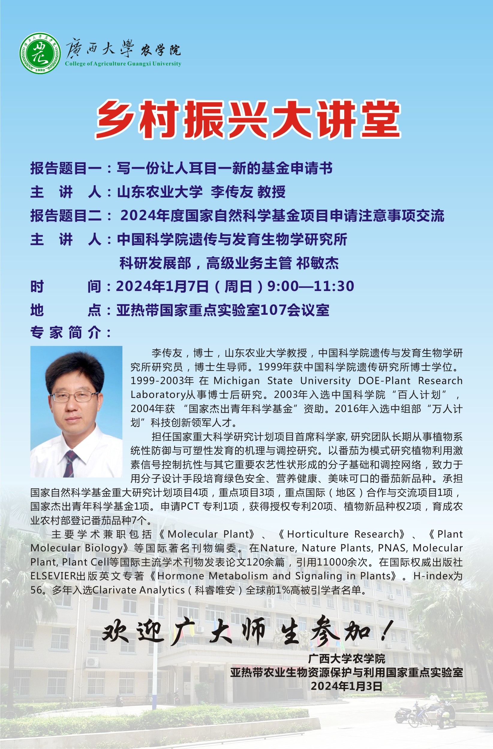 乡村振兴大讲堂-报告题目一:写一份让人耳目一新的基金申请书-李传友教授丨报告题目二: 2024年度国家自然科学基金项目申请注意事项交流-祁敏杰