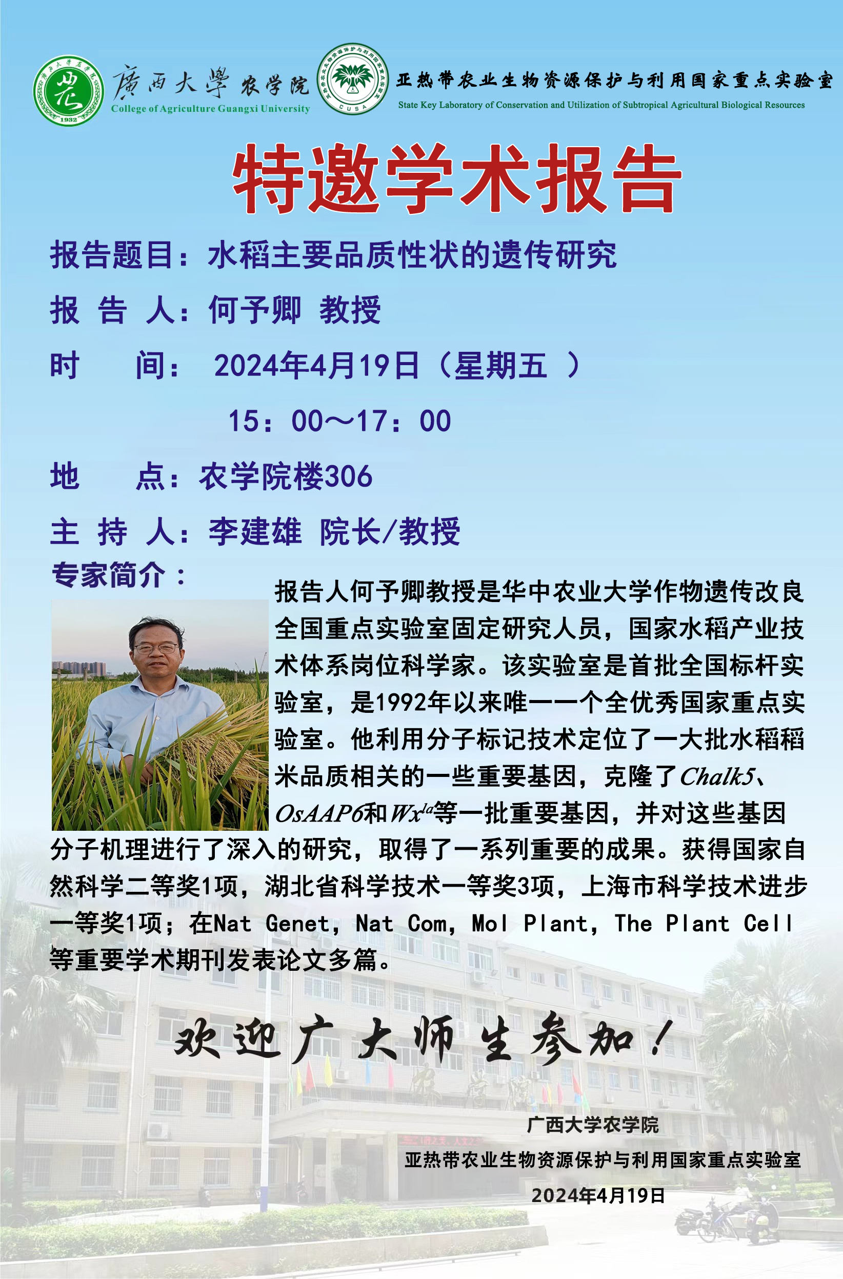 特邀学术报告-水稻主要品质性状的遗传研究