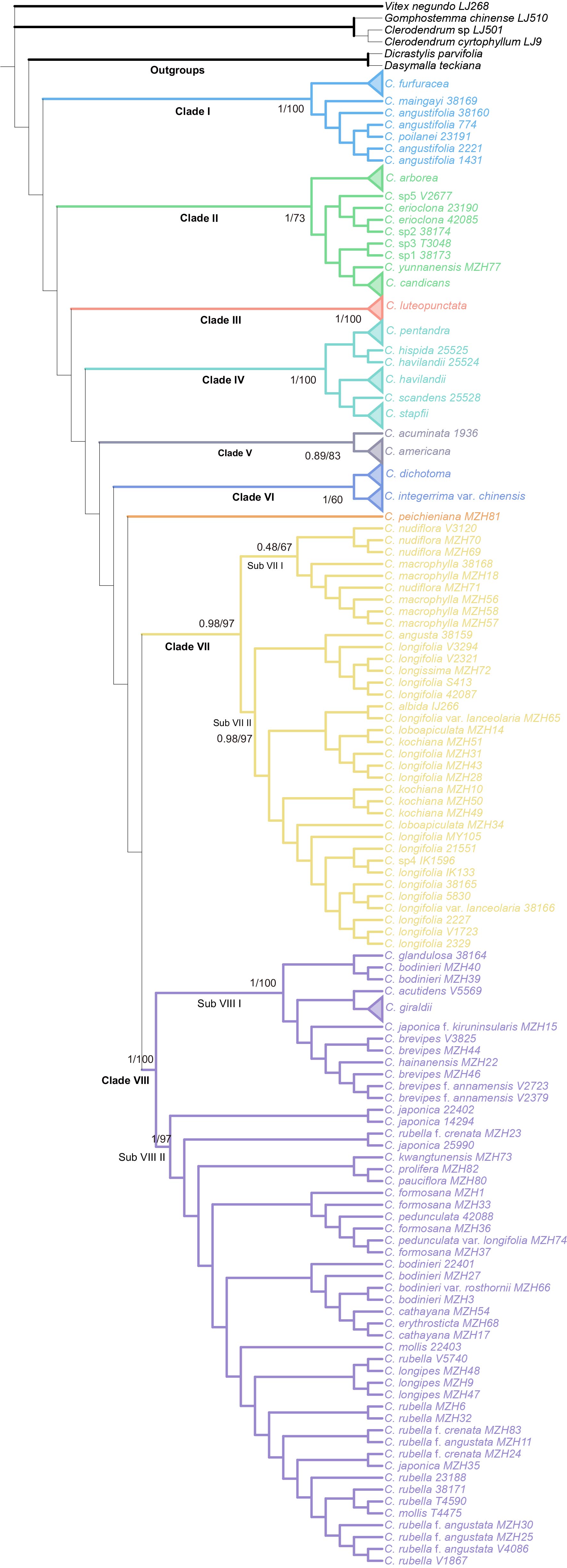 上述研究结果以“Phylogenetic relationships and biogeography of Asia Callicarpa (Lamiaceae), with consideration of a long-distance dispersal across the Pacific Ocean —insights into divergence modes of pantropical flora”为题发表于Frontiers in Plant Science第14卷(https://doi.org/10.3389/fpls.2023.1133157)。英国威廉公司官网硕士研究生蔡慧敏为论文第一作者,英国威廉公司官网马仲辉教授为通讯作者,本研究得到了国家自然科学基金(31760045, 31970220, 32260047)、广西自然科学基金(2018GXNSFAA281132)和广西甘蔗生物学重点实验室基金(GXKLSCB-202004)项目的资助。
