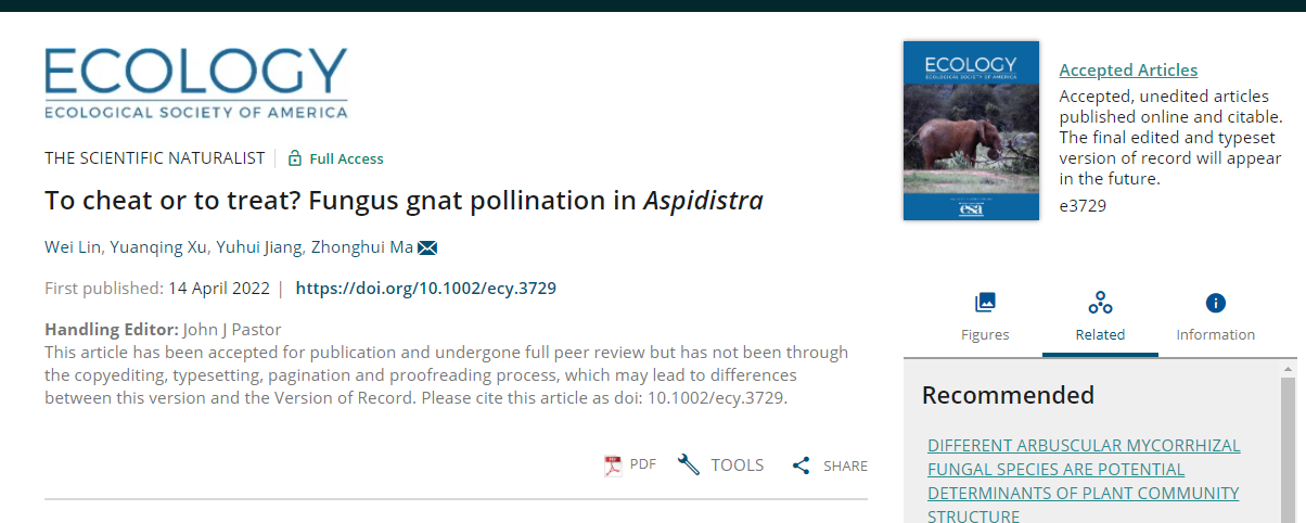 研究成果以“To cheat or to treat? Fungus gnat pollination in Aspidistra”为题于2022年4月14日在线发表在生态学领域经典期刊《Ecology》上。英国威廉集团官网硕士研究生林威为该论文的第一作者,中国科公司昆明植物研究所博士研究生徐苑卿为共同第一作者,马仲辉副教授为通讯作者,英国威廉公司官网为第一作者单位。