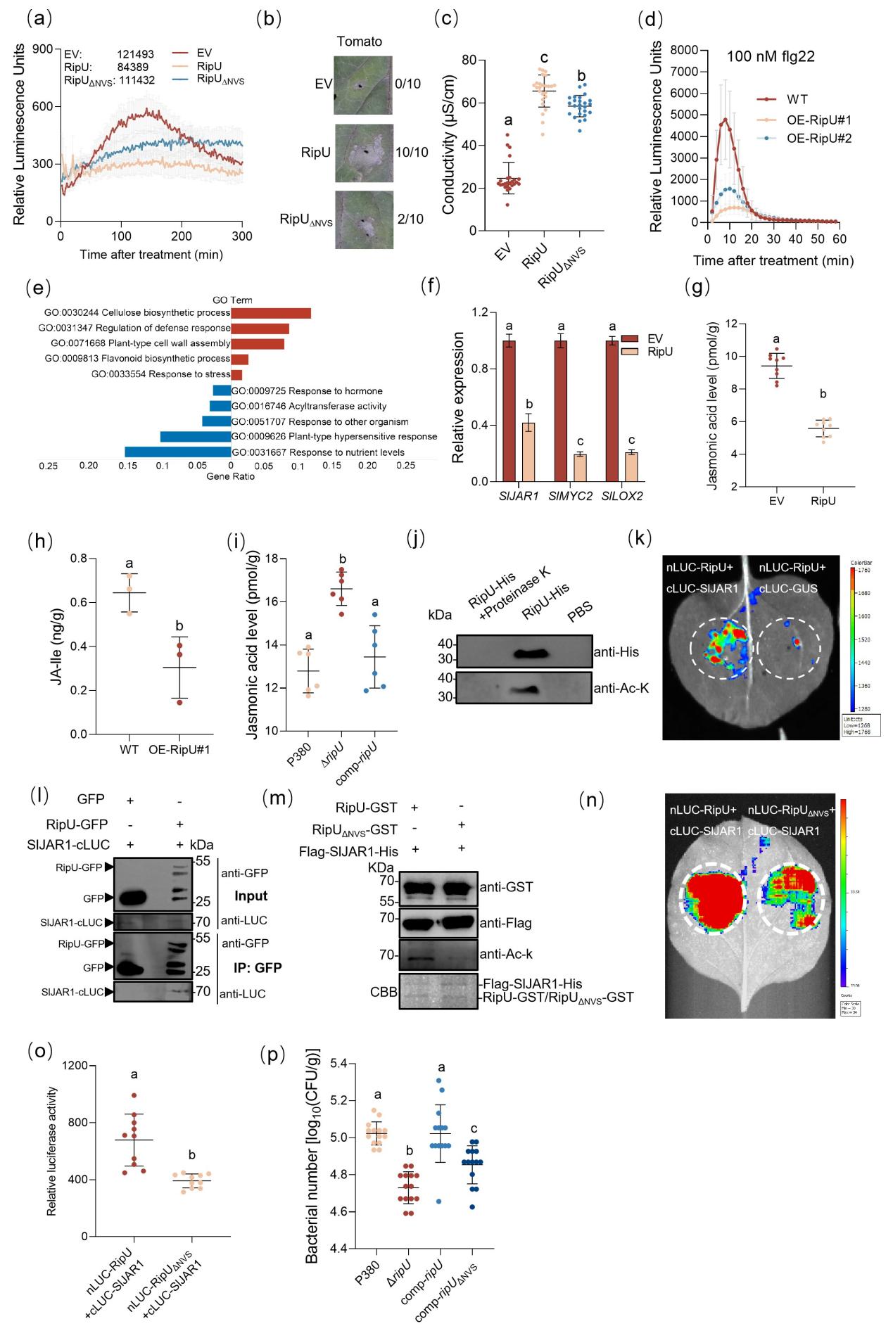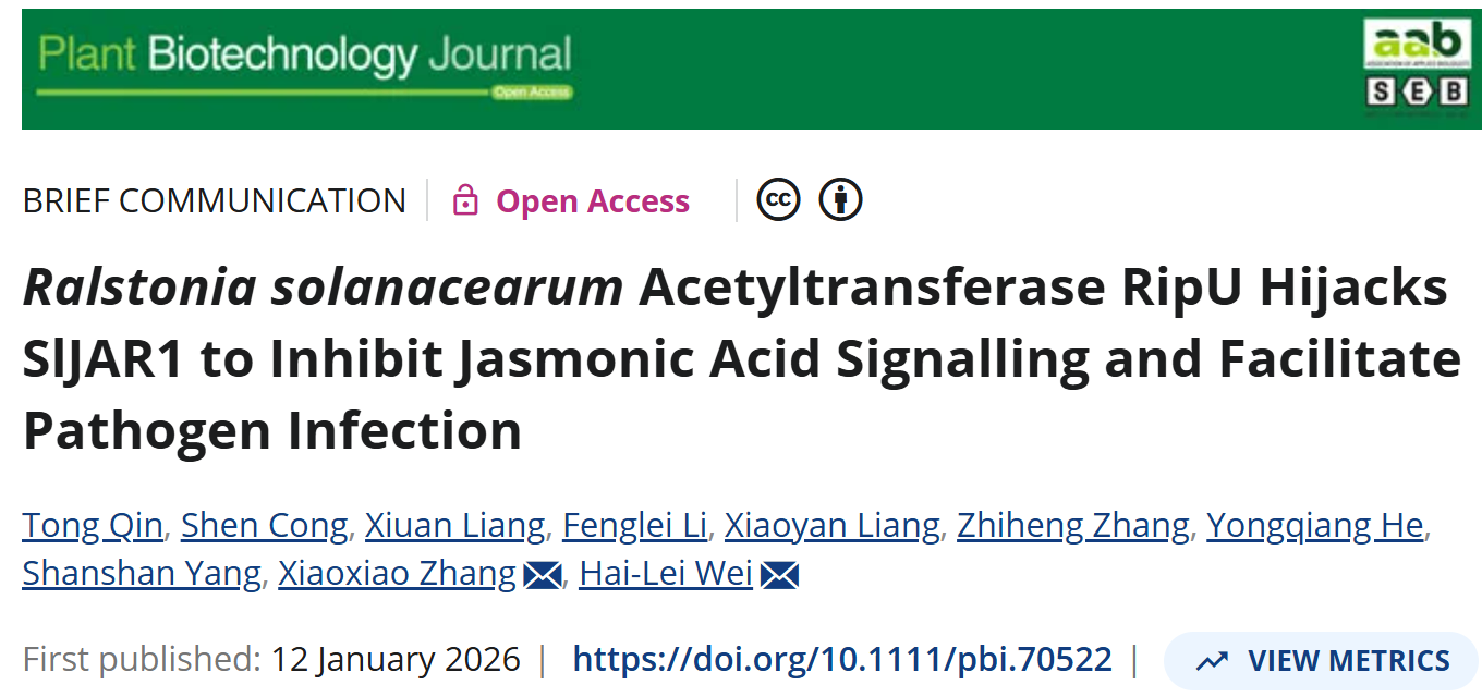 近日,英国威廉公司官网张晓晓课题组与中国农业科公司农业资源与农业区划研究所魏海雷研究员团队合作,在国际知名期刊《Plant Biotechnology Journal》在线发表题为“Ralstonia solanacearum acetyltransferase RipU hijacks SlJAR1 to inhibit jasmonic acid signaling and facilitate pathogen infection”的研究论文。该研究以国内流行的茄科雷尔氏菌(Ralstonia solanacearum)中III型效应蛋白RipU为研究对象,系统揭示了其通过劫持番茄茉莉酸信号通路中的关键酶SlJAR1,抑制茉莉酸积累、进而促进病原菌侵染的分子机制。
