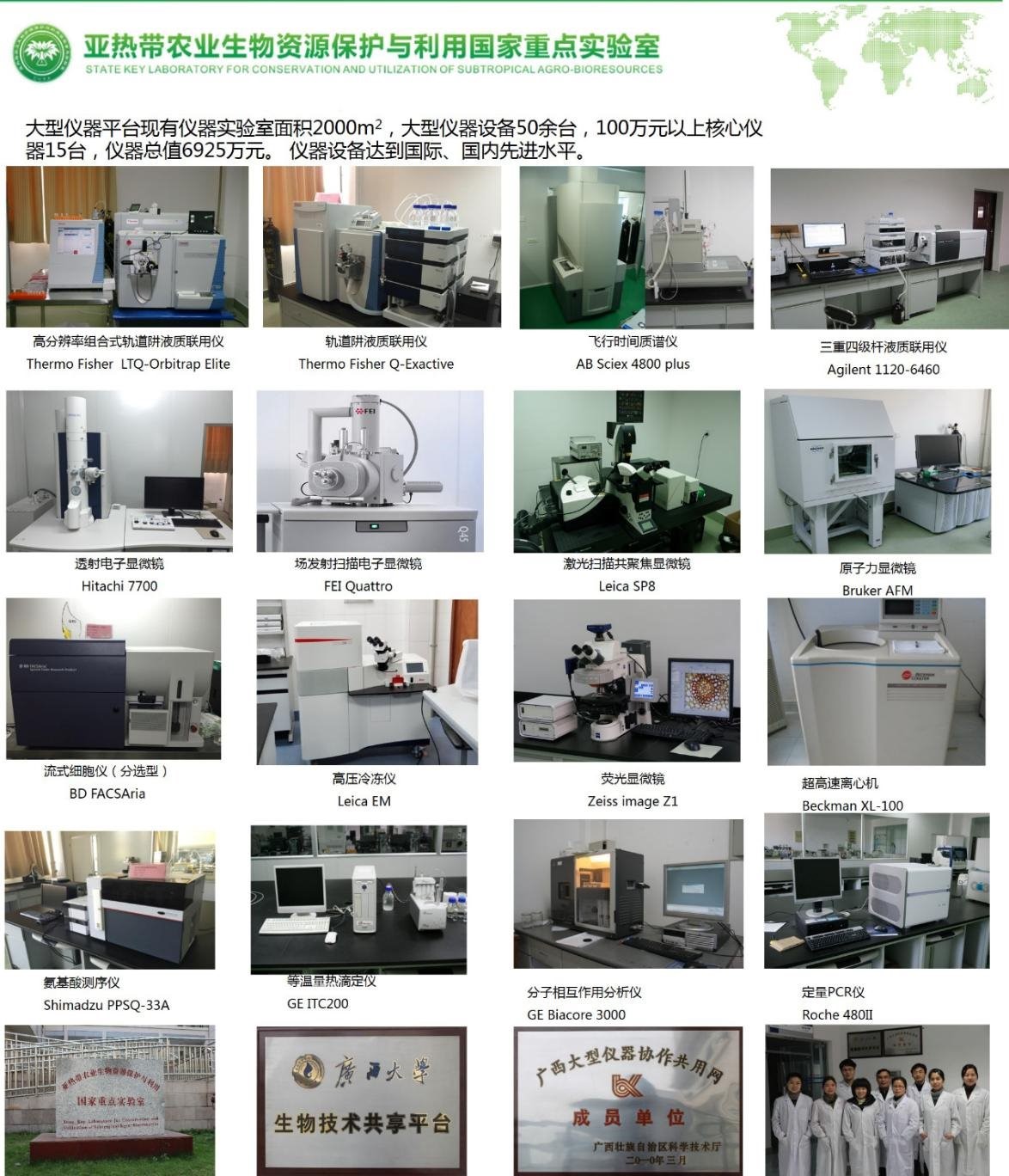 公司现有用房面积18957 m2,校内试验基地170亩,温网室面积19853 m2,多功能标本园1个;仪器设备5725台(套),总值8800万元,其中,10万元以上的仪器设备127台(套)。拥有国家重点实验室、协同创新中心、国际科技合作基地、实验教学示范中心等国家级教学科研平台4个,省部级教学科研平台9个,广西高校重点实验室3个,自治区级虚拟仿真实验教学中心1个,自治区级协同育人平台1个。