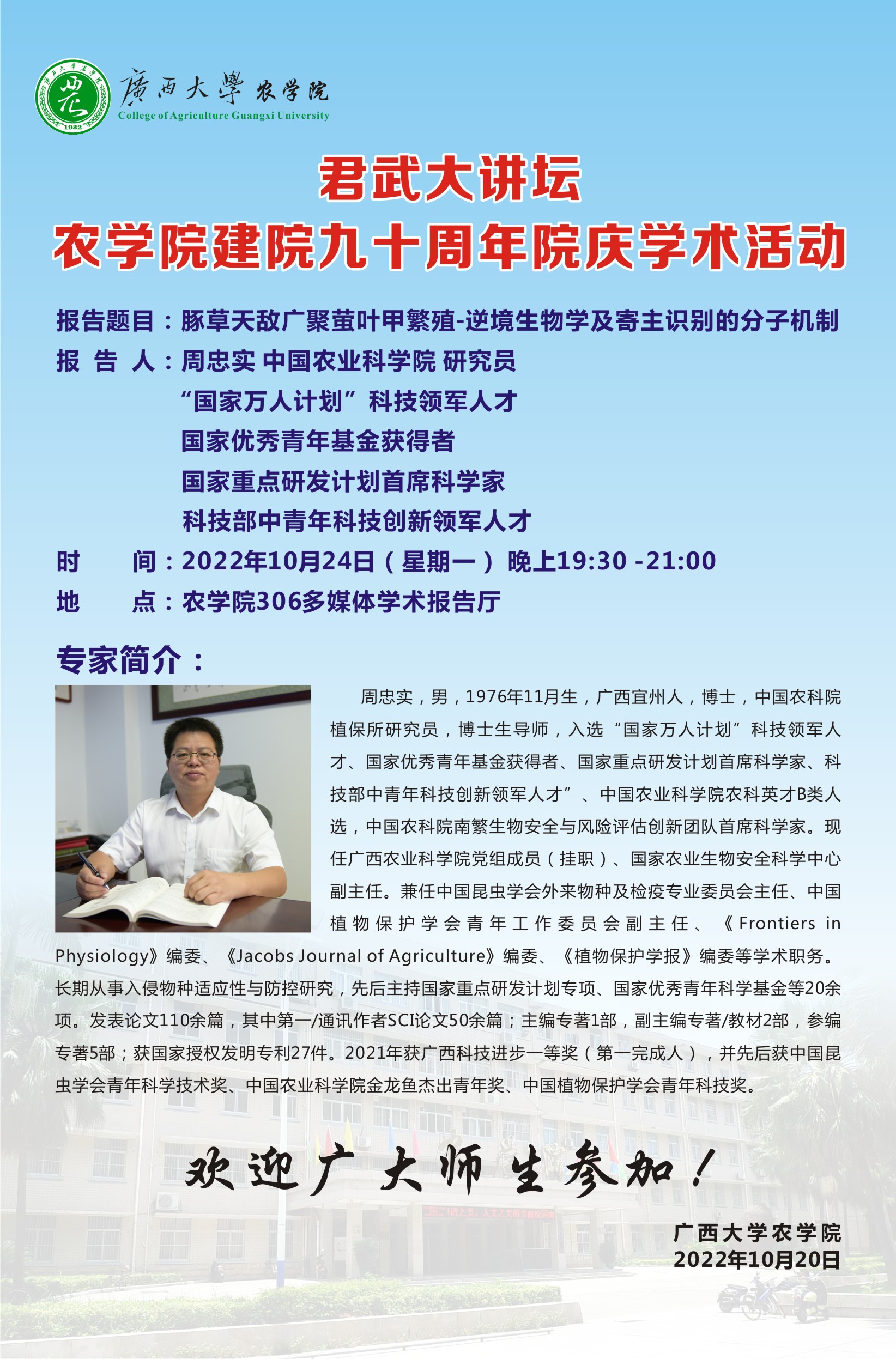 英国威廉集团官网建院九十周年院庆学术活动-豚草天敌广聚萤叶甲繁殖-逆境生物学及寄主识别的分子机制(周忠实)